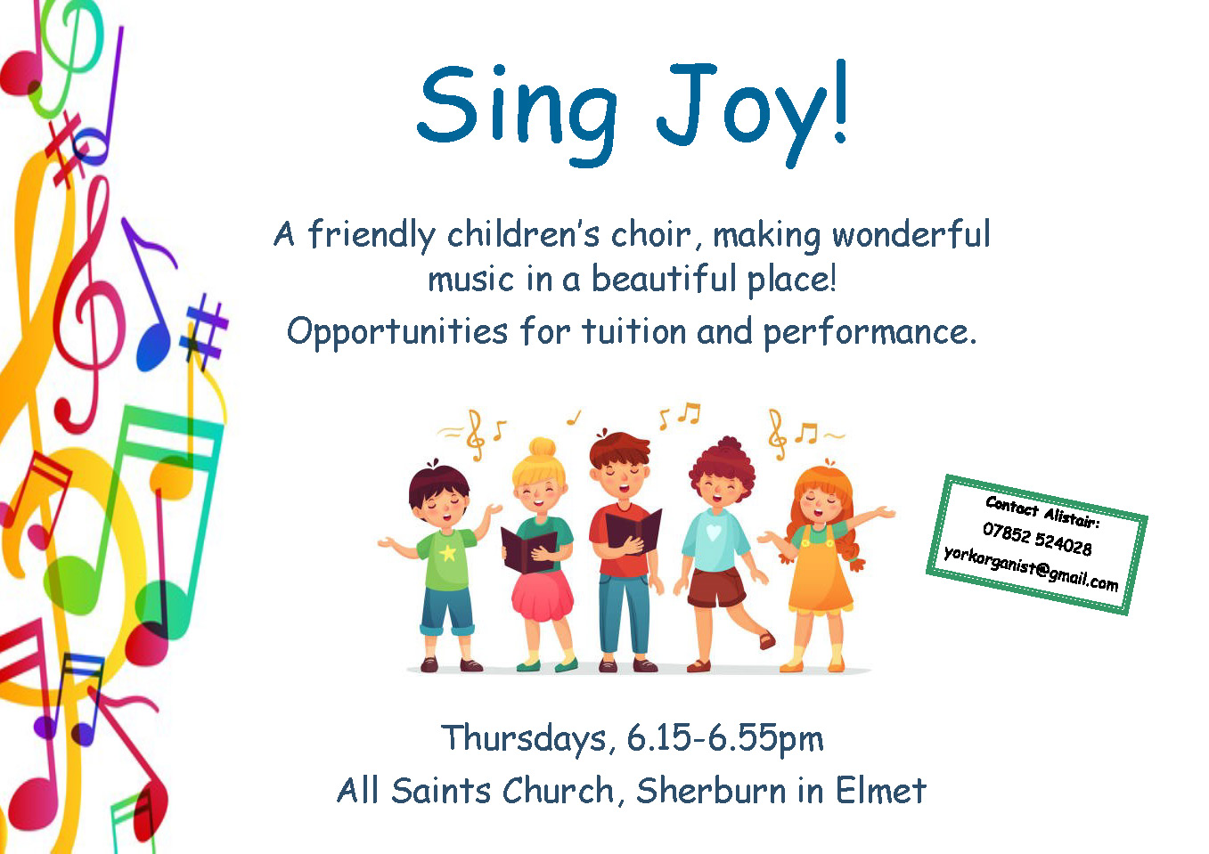 Want to try a relaxed and friendly choir for young people, with a taste for good biscuits? Sing Joy! is a successful initiative, enjoyed by a variety of school aged children from both the church and the wider community, looking at a spectrum of music as well as some matters of theory and technique. We have learnt several very beautiful songs, performed at Christmas fairs and in school halls, and have robed for Eucharists and traditional carol services. There is something for every child in Sing Joy!